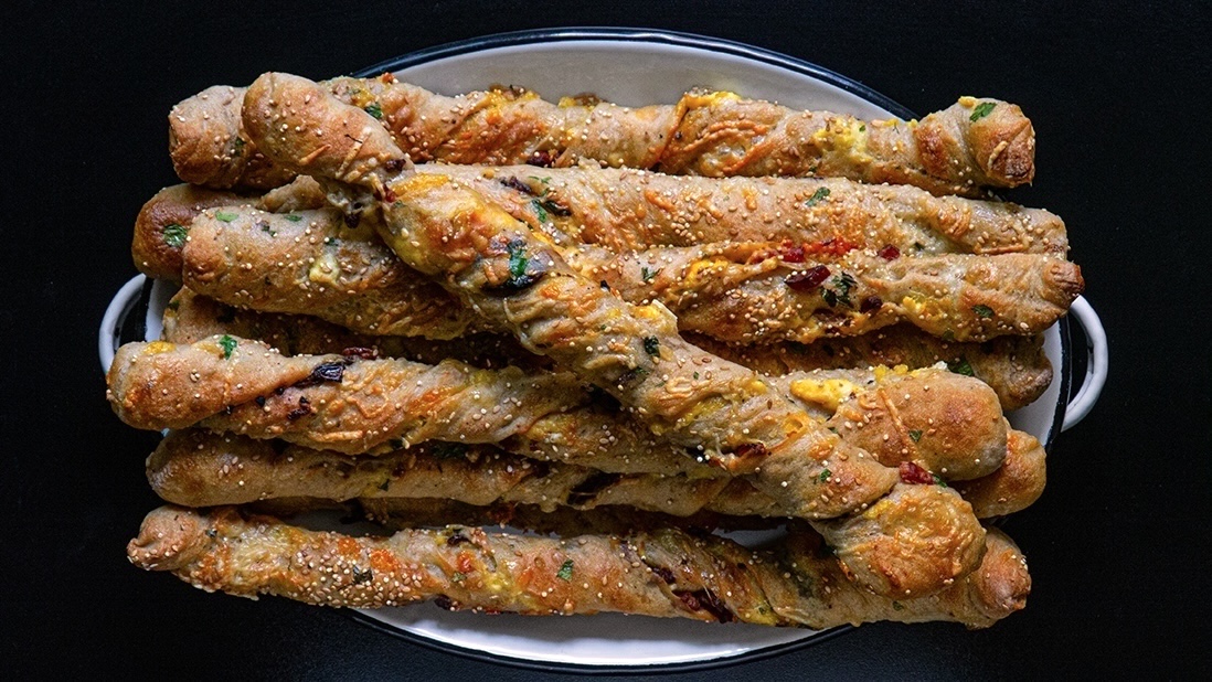 The filling includes a touch of fried onions but can be replaced or complemented with chopped sun-dried tomatoes (if you prefer to avoid the power of onions too early in the day), with a sprinkling of grated cheeses and parsley on the inside and the outside, to accompany the sesame seeds on the crust.