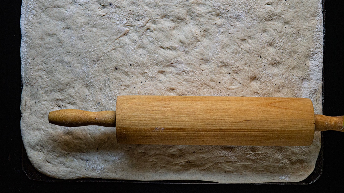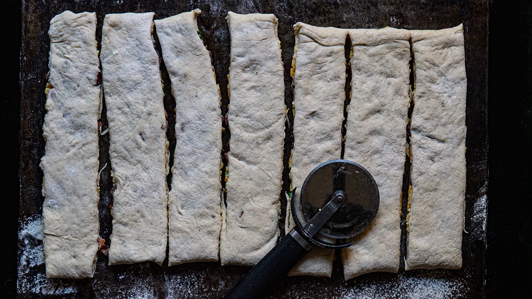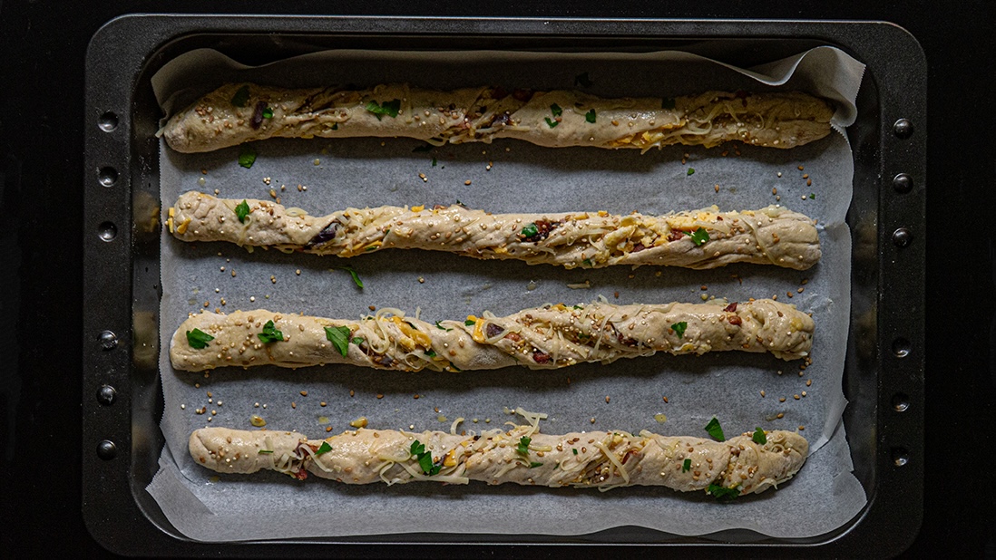 Using a professional "envelope and twist" technique, the filling is laminated directly into the dough as well as peeking out of the sides, all the way around. The result is a slender, high-impact loaf where every bite is a strategic balance of crust and core. If left flat, it bakes even flatter.