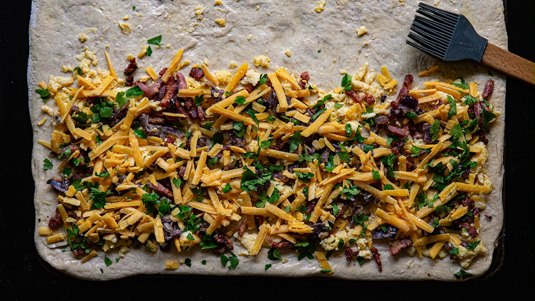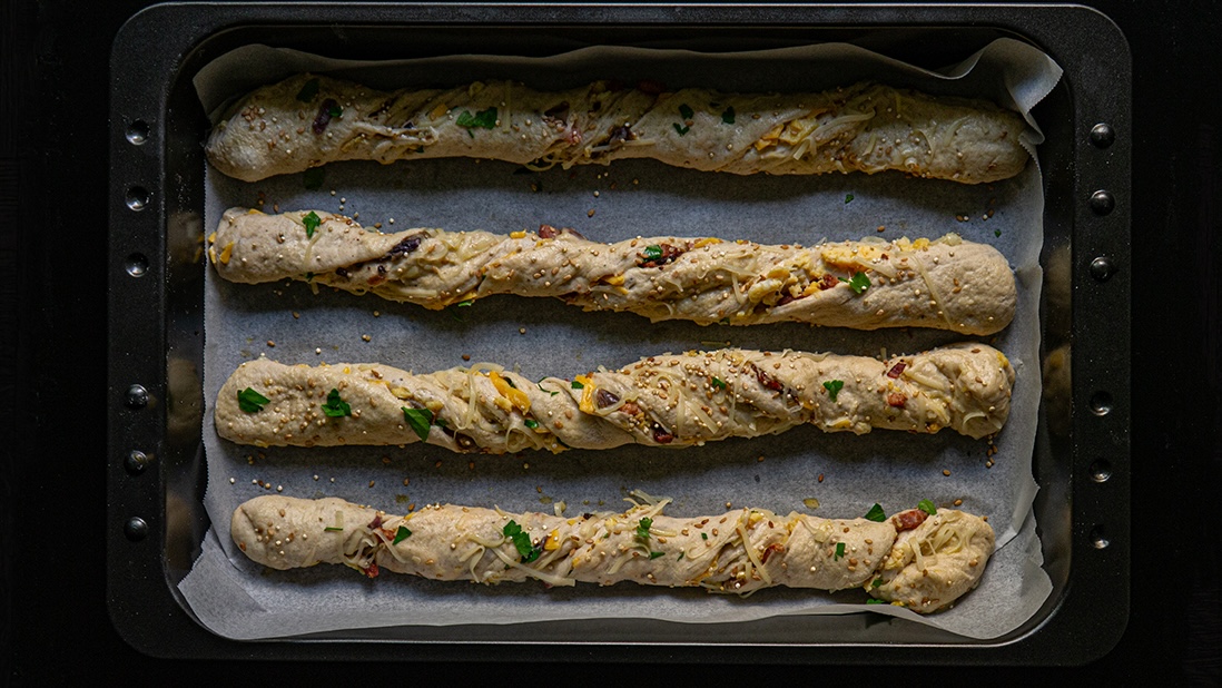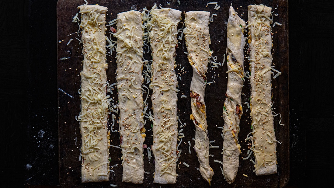 This recipe reimagines the classic French “ficelle” as a hearty, savory breakfast, lunch or snacking bread, with a generous filling of salty, smoked thick-cut bacon, soft-scrambled eggs, sharp cheddar and nutty gruyère, laminated directly into the dough, becoming a slender, high-impact loaf where every bite is a balance of crust and core !