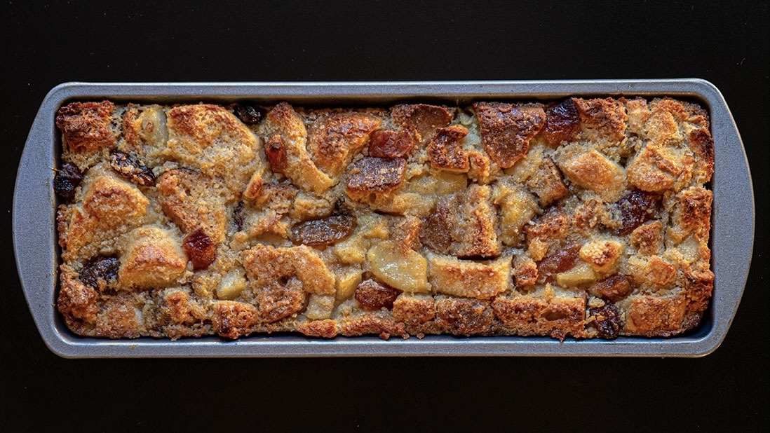 Leftovers, even when dried out and stale or overripe and mushy are ingredients with potential that can be transformed into nourishing treasures and I’m quite certain that after all the winter holidaying and feasting, that you too have all the ingredients handy for this custardy bread pudding, crunchy on the top and creamy on the bottom !