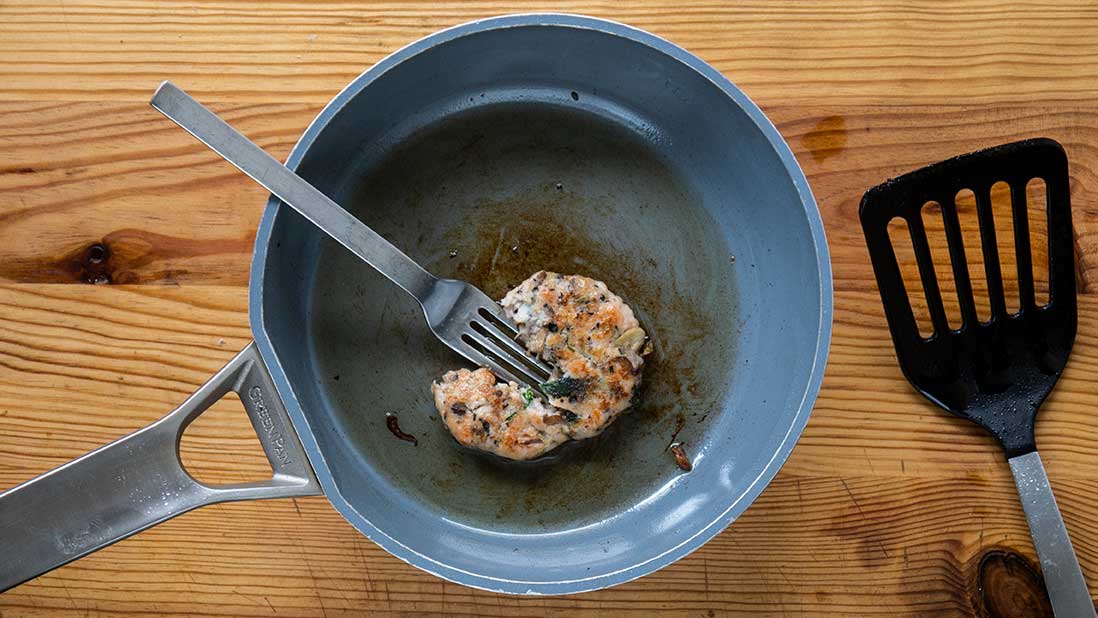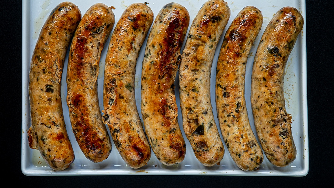 The technique involves extracting most of the water from these vegetables, then slowly cooking them in duck fat so that they absorb it. Afterwards, they are combined with ground turkey breast meat, raising the overall fat content to approximately 9% or 10%. While this is still less than that found in beef or pork sausages, it significantly improves the sausage’s texture and flavor.