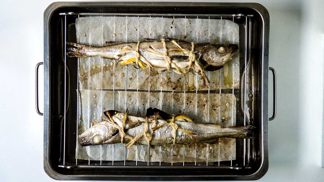 - tie up your fish (to retain the aromatics stuffing) and broil for 5-7 minutes on each side at 210°C on the upper middle or top rack of the oven