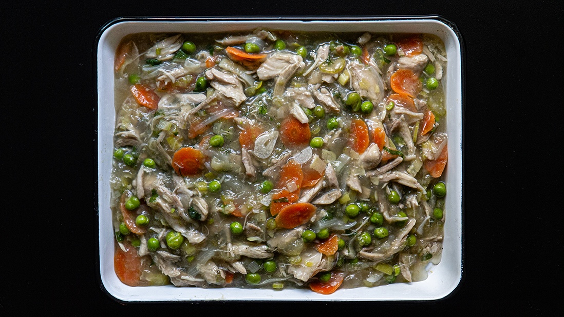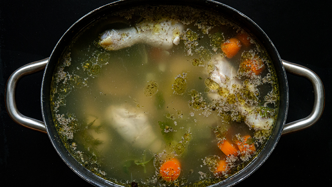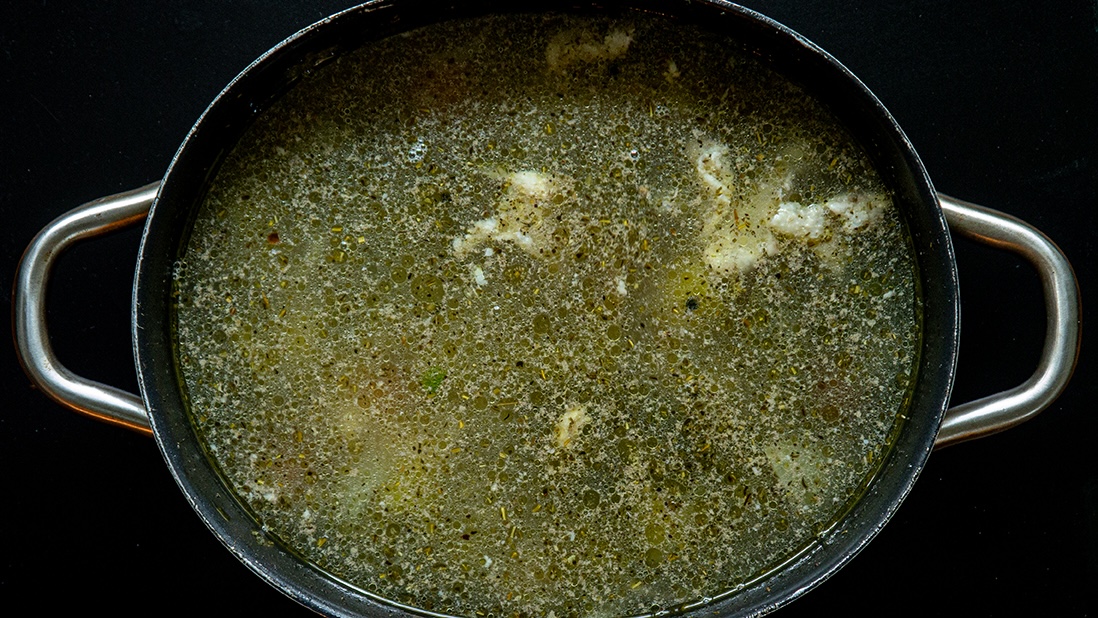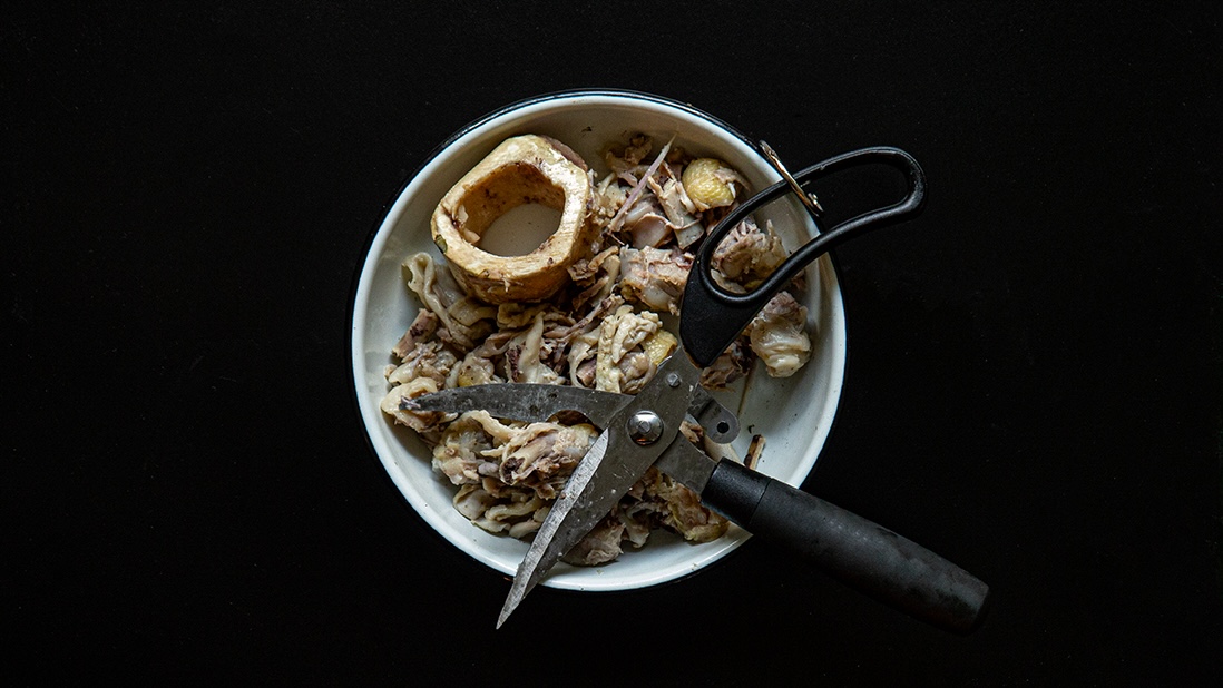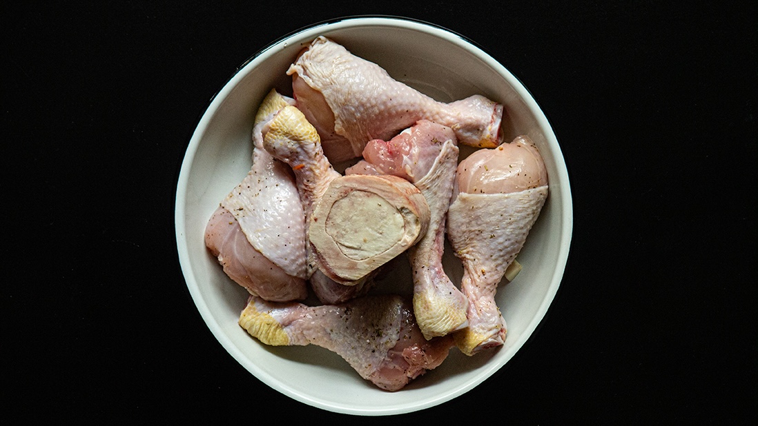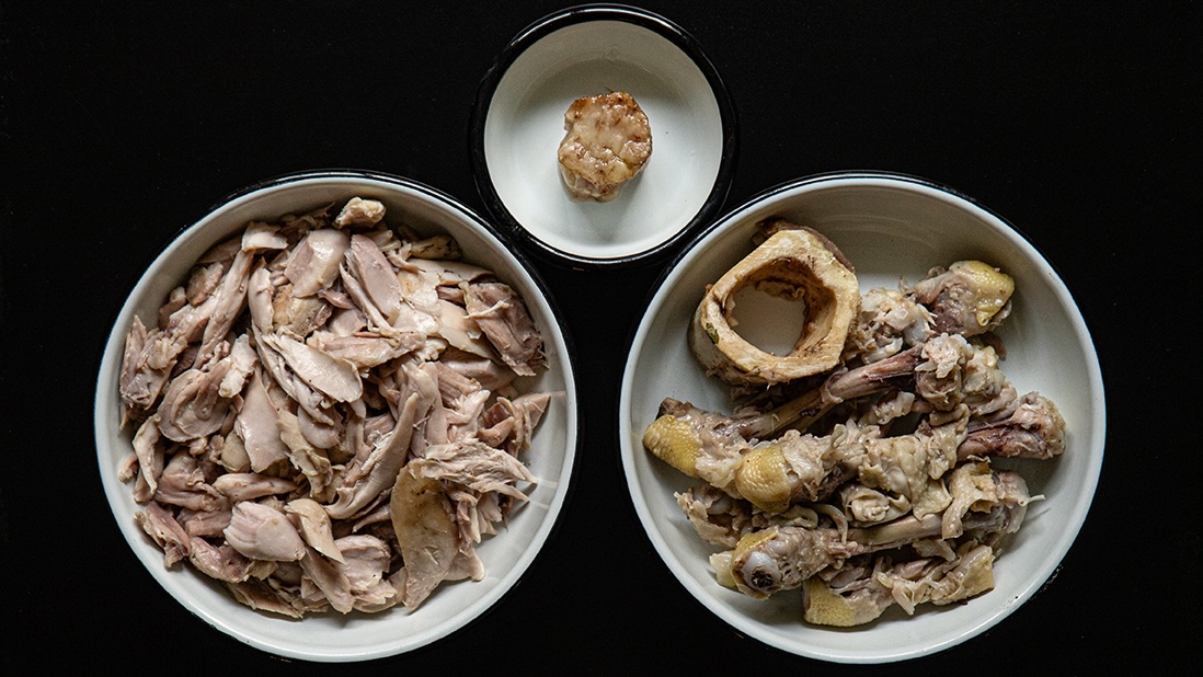 - 225 g (2 tasses) d’os et de peaux de poulet, découpés avec des ciseaux de cuisine