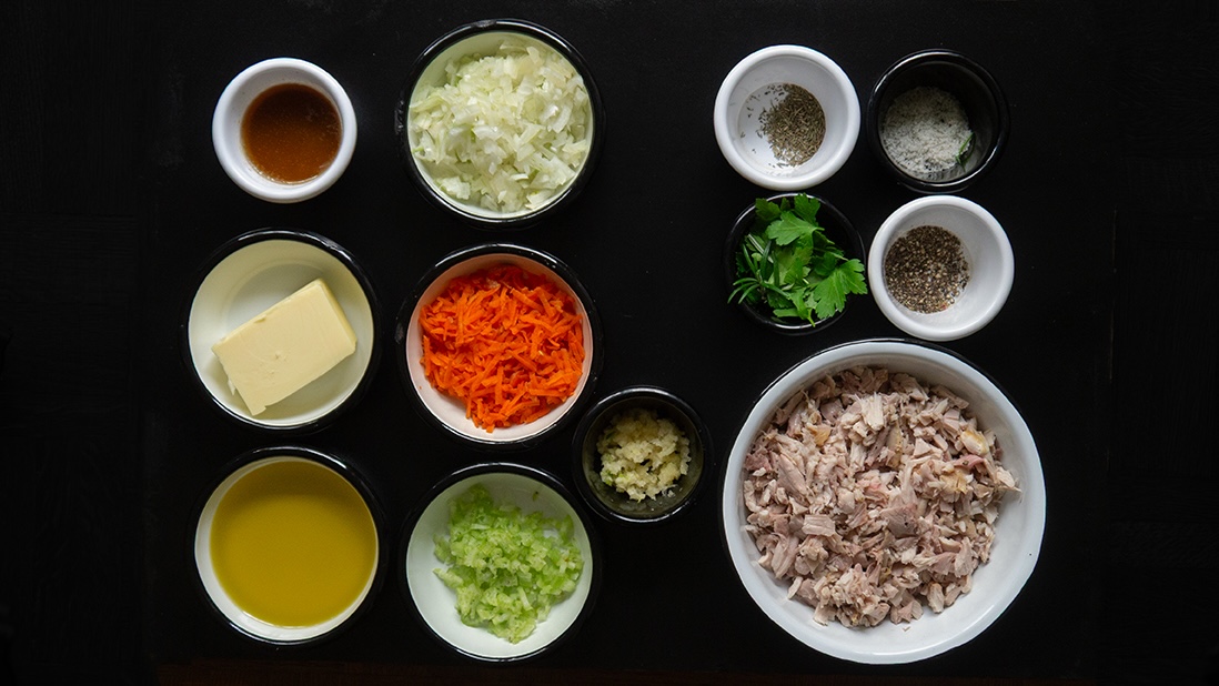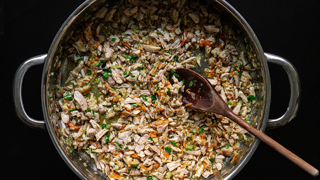 - 250g (2 tasses) de poulet rôti, effiloché et haché
