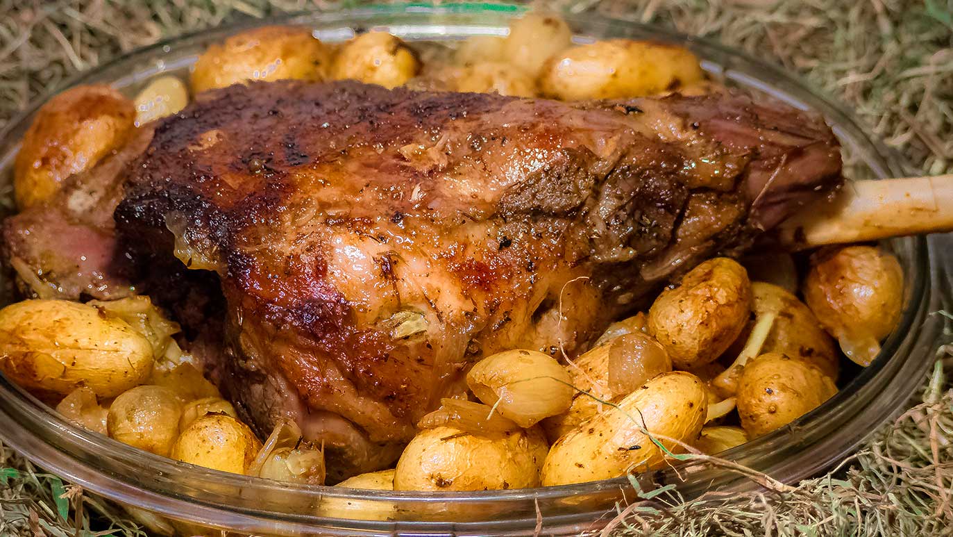 - sortir l'agneau du frigo et le placer dans la cocotte sur un lit de foin et brindilles d'herbes aromatiques, recouvrir de foin et brindilles également, verser le jus de citron et huile d'olive par-dessus et mettre le couvert